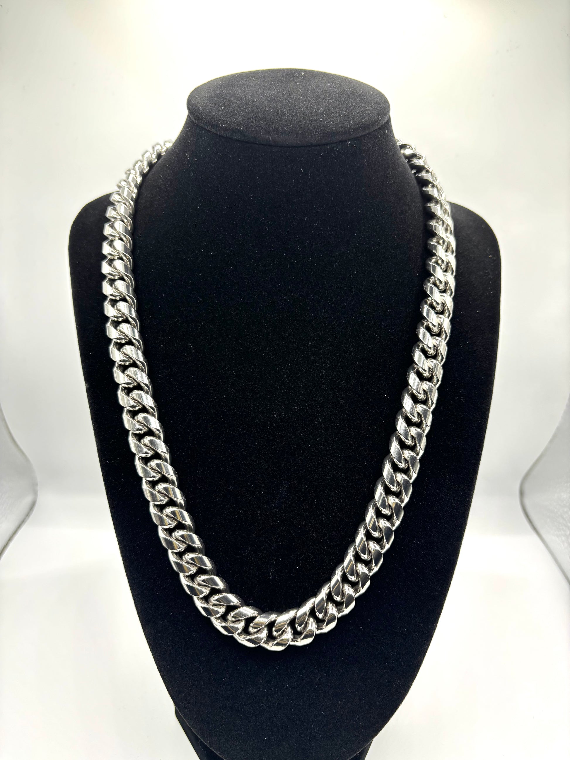 Take on the day with confidence and style with our Silver plated Cuban Chain! This sleek and stylish chain is perfect for daily wear, adding a touch of boldness to any outfit. With its 12mm width, it's sure to make a statement and show off your risk-taking attitude. Elevate your look and embrace the adventure!